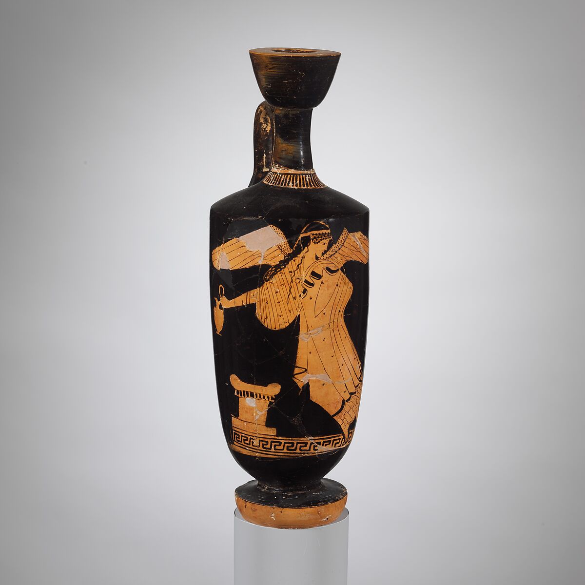 The point of reference for a vase such as this one is difficult to identify. The image probably represents a libation offered for a victory. It is unclear whether the lekythos was purely funerary in function. If so, the vase may have served for the burial of an athlete.