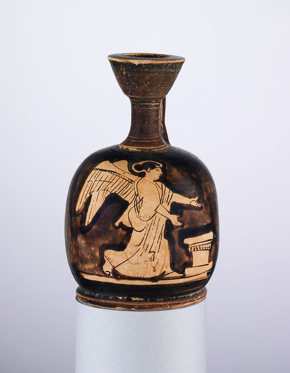 Nike, the personification of victory, runs to an altar with outstretched arms. Despite the loss of glaze, it is possible to surmise that Nike held a wreath in her hands. This is a common attribute of the goddess, since it is the quintessential symbol of that which she embodies.