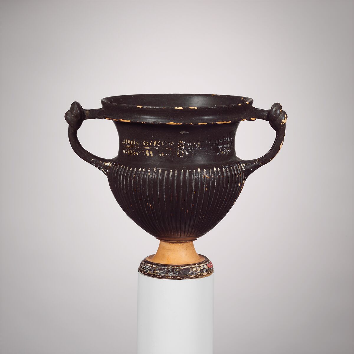 The knotted handles and the ribbing are characteristic of the latest phase of Gnathian pottery.