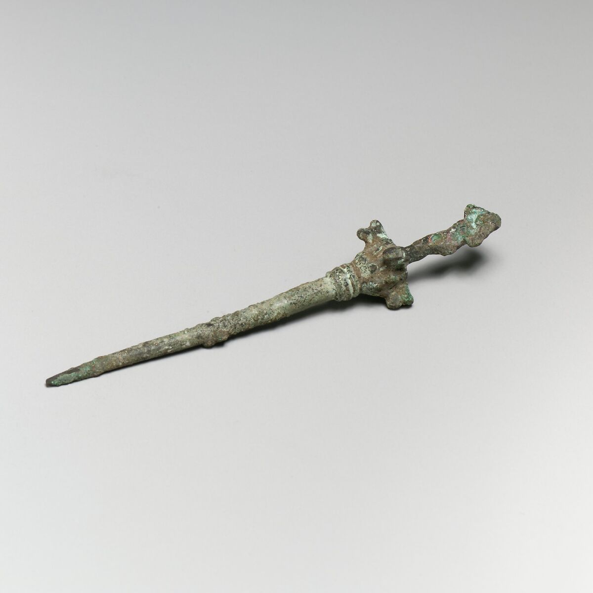 The head of the pin is in the form of Aphrodite Anadyomene standing on a Corinthian capital.