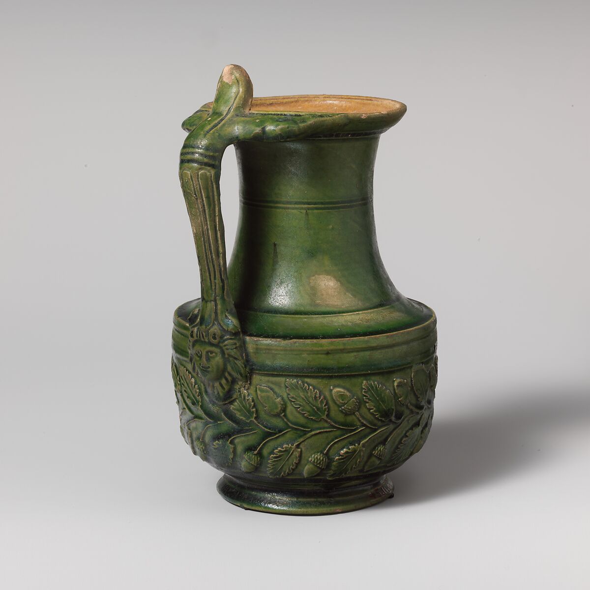This jug is attributed to one of the workshops producing lead-glazed vessels at Tarsus in southeast Asia Minor. Most of the production was devoted to making drinking cups, and this is a rare example of a different shape that was clearly much influenced by contemporary metalwork.