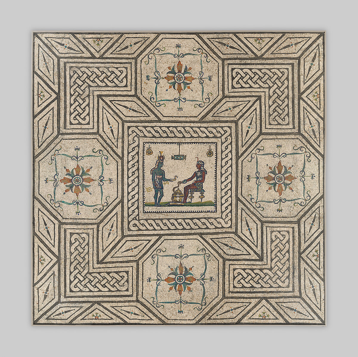 The mosaic, made of stone and glass tesserae, was found near Prima Porta, just north of Rome, in 1892. It was one of several mosaics uncovered in a villa complex. The two figures in the central panel wear Egyptian dress; the man standing on the left has been identified as a priest, making an offering to the seated figure, regarded as the goddess Isis. However, the interpretation of the scene remains problematic. Egypt held a special fascination for the Romans as a land of great wealth and antiquity, and its exotic character is often found reflected in Roman architecture, statuary, frescoes, and other decorative arts. The scene may therefore be imaginary, intended merely to convey an Egyptian atmosphere. The surrounding geometric and floral designs, on the other hand, are typically Roman.