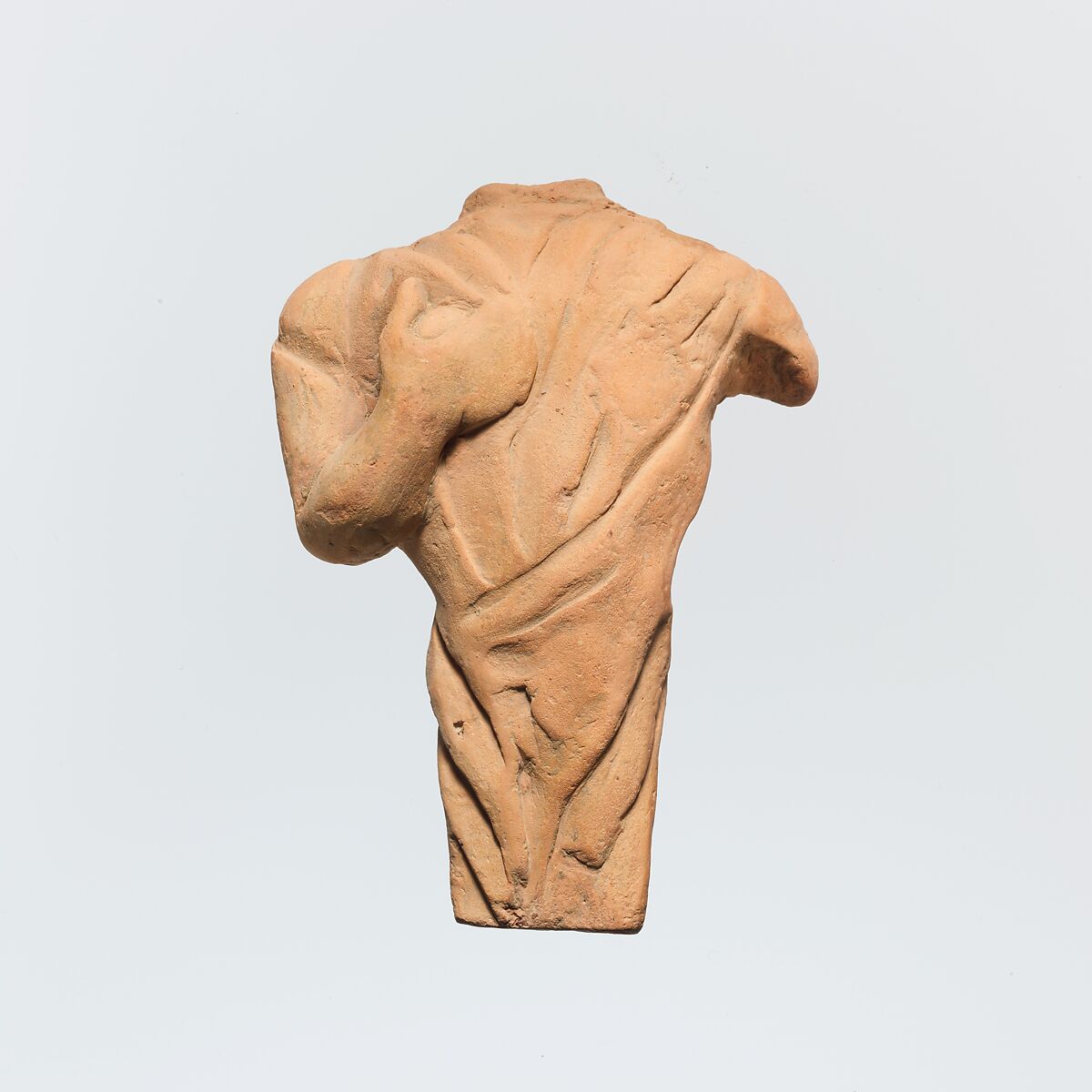 The missing proper left arm probably repeated the position of the right one. This figure may have been shown holding her breasts.