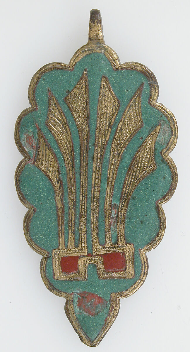 Heraldry, or coat-of-arms, were vitally important in Europe throughout the Middle Ages and the Renaissance. Heraldic emblems were used to identify noble families, cities, regions, and even countries. In addition to being displayed on shields and flags, heraldry was incorporated into architectural decoration on the interior and the exterior of buildings, on furniture, works of art, clothing, and horse equipment. Harness pendants, like this example, would have been attached to a headstall, bridle, or other straps making up the tack of a horse ridden by a nobleman or noblewoman, or a member of their household. Many harness pendants also have decoration that is simply ornamental, or have symbols that are not specifically heraldic in nature.