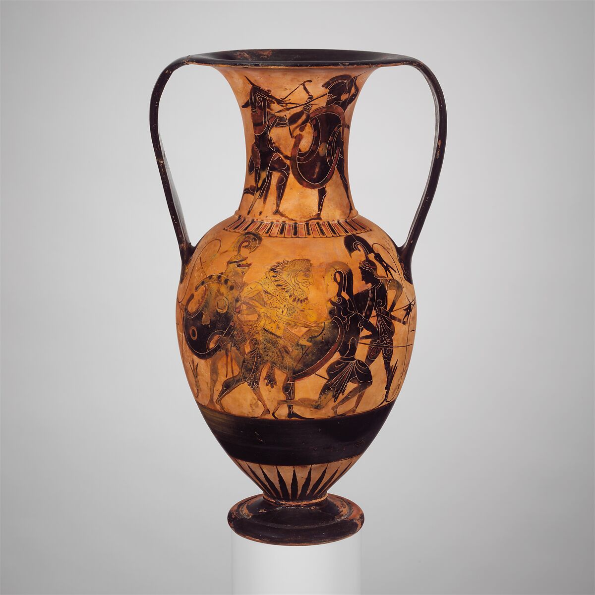 Obverse, Herakles fighting Amazons; on the neck, fight
