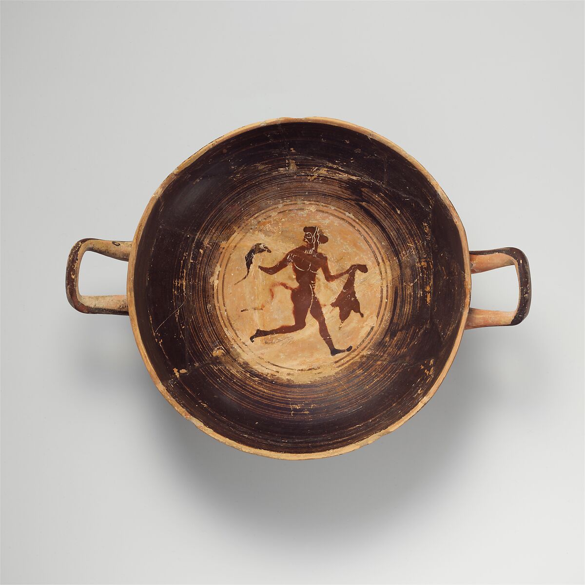The interpretation of the well-established subject of Achilles and Troilos on the exterior suggests a painter unfamiliar with the canonical story. According to the latter, the Greek hero Achilles lies in wait for the Trojan prince Troilos near a fountain house where Polyxena, Troilos' sister, fetches water. When Achilles attacks Troilos, Polyxena runs off, dropping her hydria (water jar). This cup shows Polyxena and Achilles on either side of the fountain house; Troilos may be the warrior running up from the other side.
