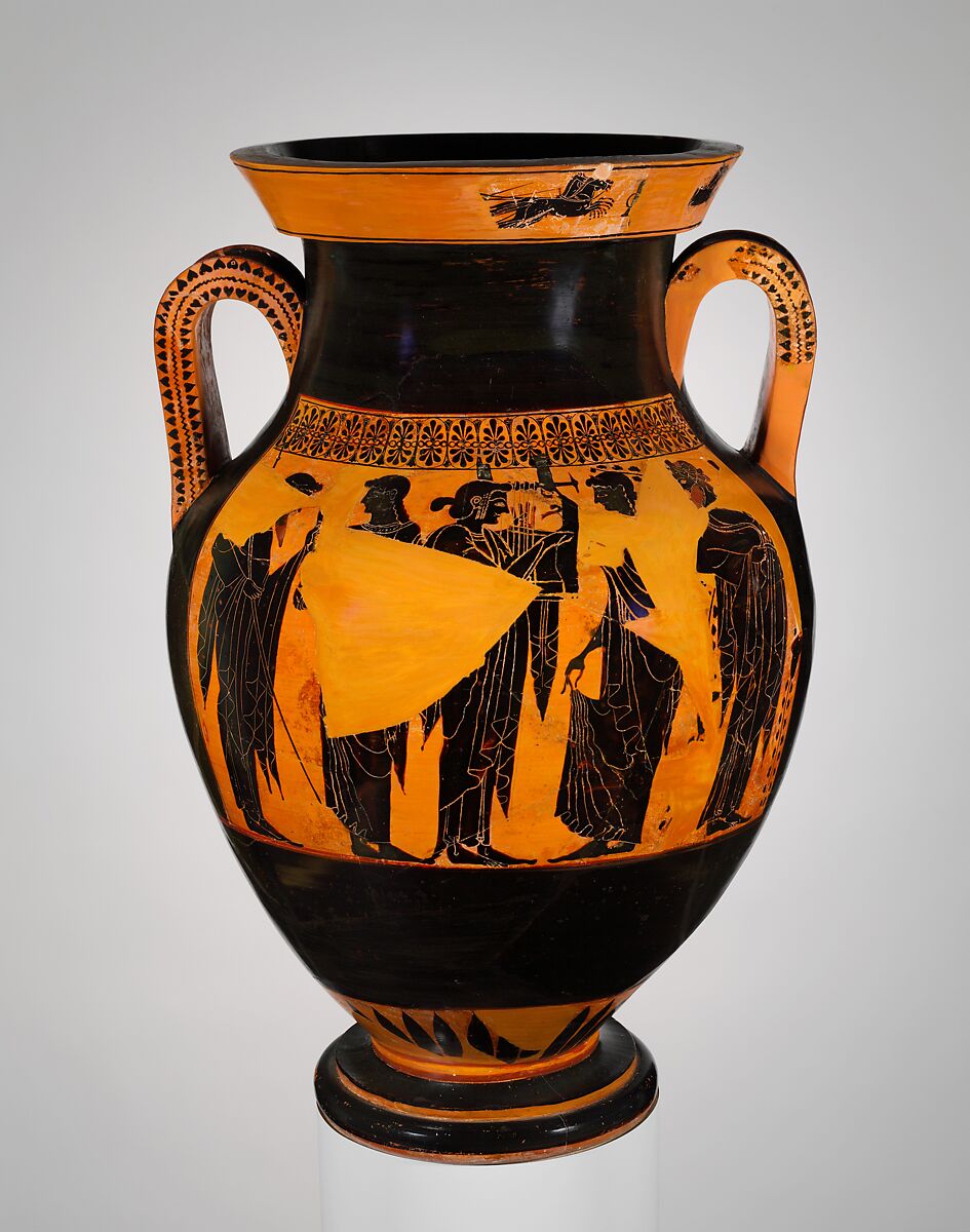 Of particular interest on this vase is the frieze of racing chariots on the lip. Subordinate bands of figural decoration were introduced at various times and on various shapes in Athenian vase-painting. At the end of the sixth century B.C. and in the early fifth, decoration on the lip occasionally appears, especially on amphorae type A. The most significant instance of this feature in the Museum's collection appears on the amphora signed by the potter Andokides and displayed in the Greek galleries on the main floor.