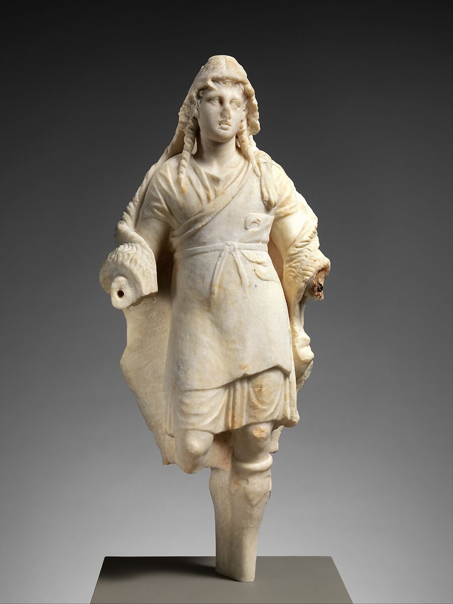 The god wears Thracian boots, a short chiton, a belted panther skin, and a goatskin worn like a cape, with the forelegs of the goat wrapped around his arms. He can perhaps be identified as Dionysos Melanaigis (of the Black Goatskin), whose cult was introduced into Attica from Boeotia. Pausanias (II.35.1), second century A.D. author of a guide to Greece, mentions a temple to Dionysos Melanaigis in Methana on the Saronic Gulf and states that a music competition was held there in the god's honor every year and that prizes were awarded for swimming races and boat races.
