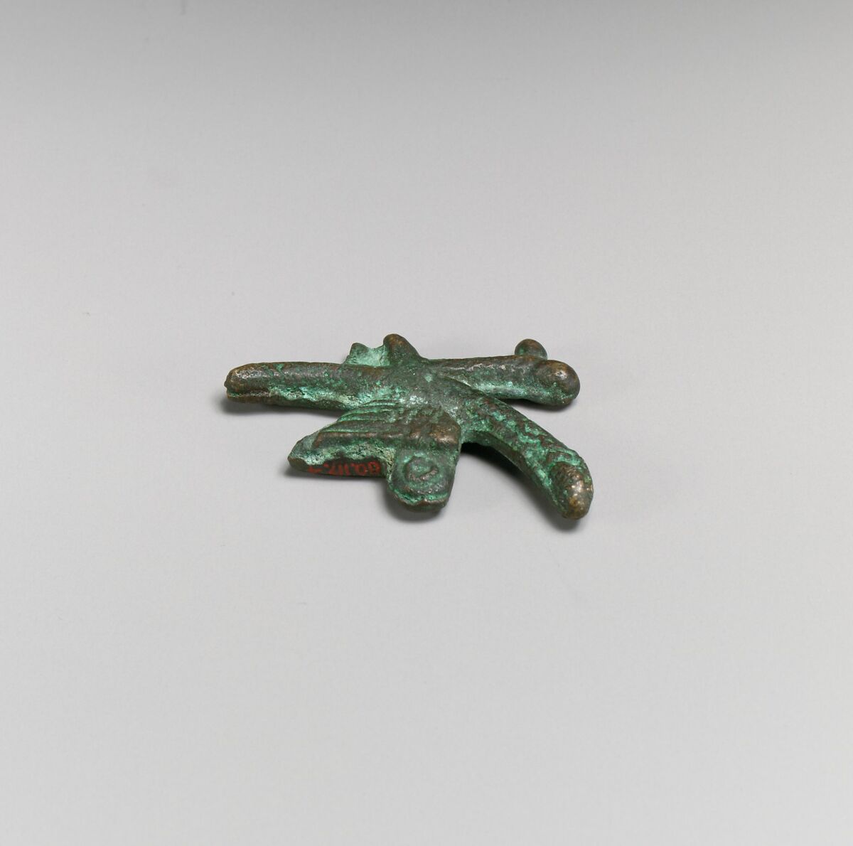 This amulet is of unusual form. Commonly, the phallus, presented in symmetrical double form on amulets, is winged, but the three winged phalli that project from this ornament are very different in shape, position, and style. Unlike the symmetrical phallic amulets in this case with (60.117.5, 60.117.7-9), this pendant perhaps is intended to ward off evil coming from all possible directions.