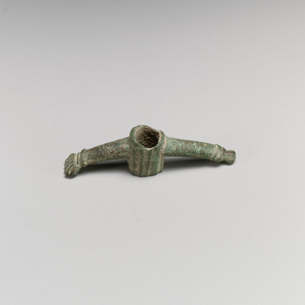 The form of this phallic amulet is unique. Commonly, the phallus and arm project from a central pubis or scrotum. On this unusual pendant, the two extensions meet at a central cylinder, creating the appearance of arms extending from a torso.