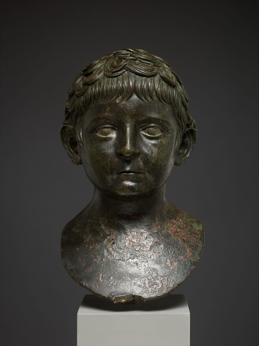 This life-size portrait bust of a young boy, originally affixed to a herm of wood or stone, was made by a gifted sculptor who endowed it with great presence. His large soulful eyes are inlaid with silver, and his hair is arranged in thick layers of curls that even cover the backs of his ears. The boy's identity is unknown since no inscription is preserved, but the high quality of the sculpture has often led to the suggestion that he represents the emperor Nero as a child. Since Nero was already 13 years old in A.D. 50, when he was adopted by his great uncle and stepfather, the emperor Claudius, it seems unlikely that he is in fact the person portrayed here. Nevertheless, the style of the bust is very much in keeping with late Julio-Claudian portraiture.
