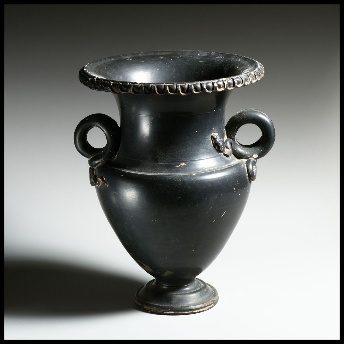 The distinctive ring handles are in the form of two snakes whose heads and tails are modeled carefully in relief. Snakes were often connected with death and rebirth in the ancient Mediterranean world. At least one vase of this specific type is known to have been used as a cremation urn.