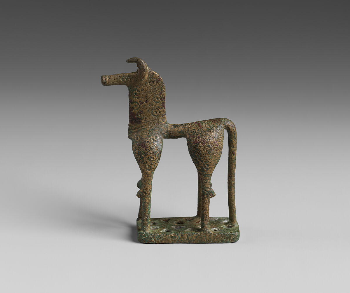 Thousands of early bronze horses were found in most sanctuaries of ancient Greece, especially in Olympia. They served essentially as personal offerings to the gods. This example was probably made in Corinth.