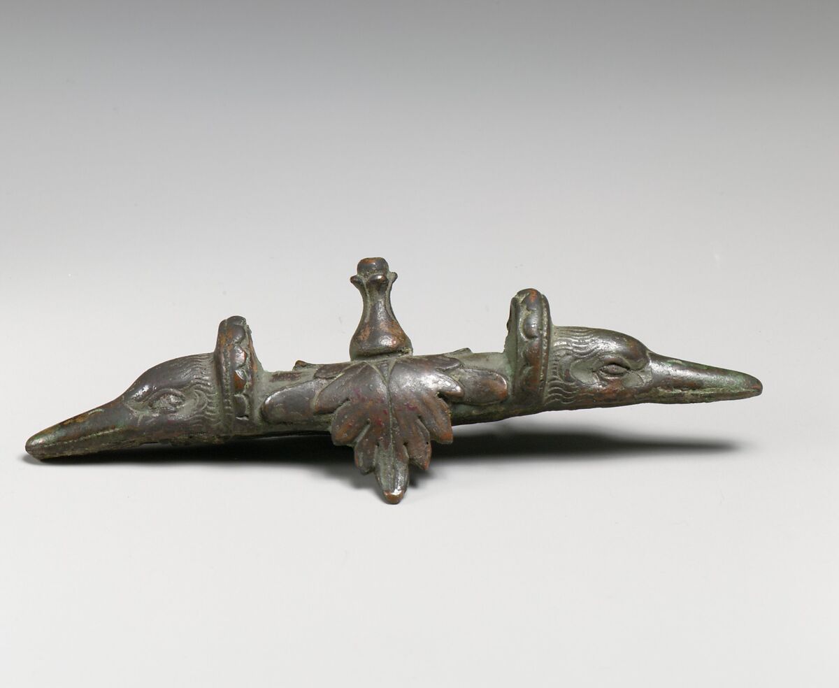 This handle attachment would have been mounted to the rim of a basket-shaped vase, with the swinging loop handles themselves fastened between the duck heads. A complete example of such a handle adorns the bronze basket vase (1989.281.86) displayed nearby.