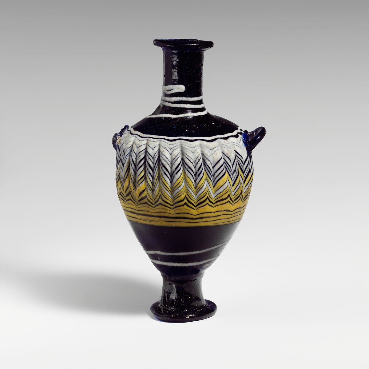 Uneven horizontal rim-disk, with rounded edge; tall cylindrical neck; broad sloping shoulder; ovoid body; applied tall outsplayed foot, with rounded edge and deep tooled indent in center of flat bottom; below shoulder, two flattened loop handles projecting at an upward angle from body, applied over trail pattern.