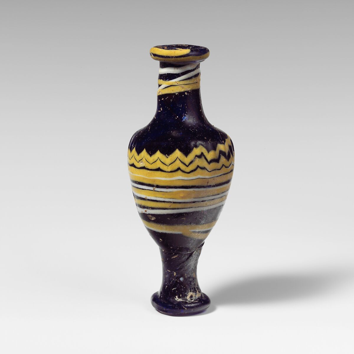 A white trail attached at underside of rim-disk, drawn back in opposite direction, wound once round top of neck as a hoizontal line, then spirally over neck and shoulder; a yellow trail attached at edge of mouth and wound round rim-disk, then spirally down neck and shoulder over white trail; both tooled into a narrow zigzag band with close-set vertical indents around top of body, then wound almost horizontally around middle of body, drawn down spirally, and ending in another almost horizontal line on lower body.