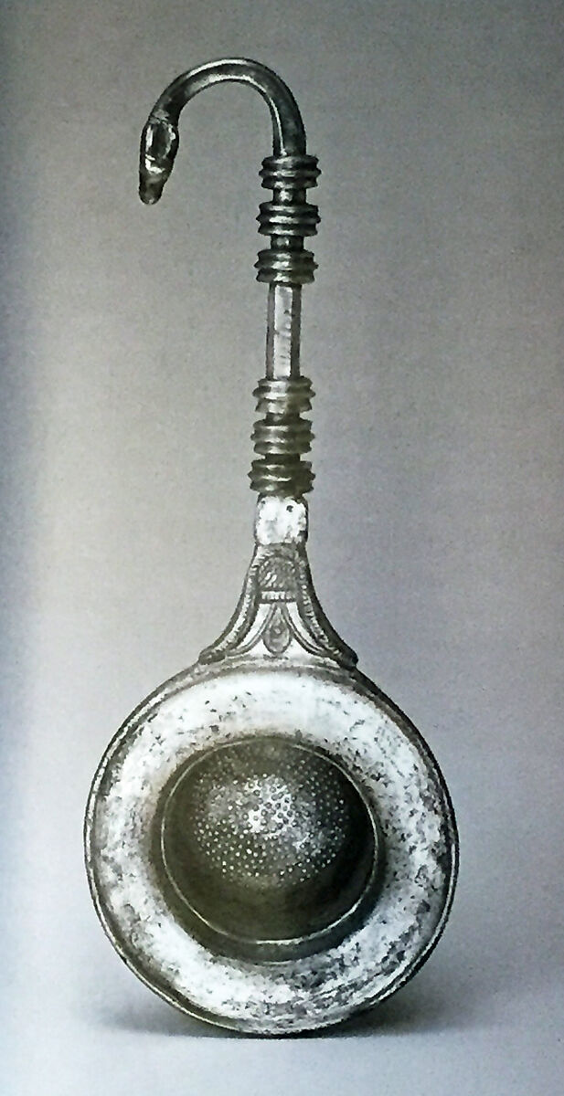 Domed shaped and set off from the broad, slightly slanted rim with a collar. The stem is reinforced with two groups of three profiled rings, and its upper end curves in a semicircle to the left, terminating in a calf's head.