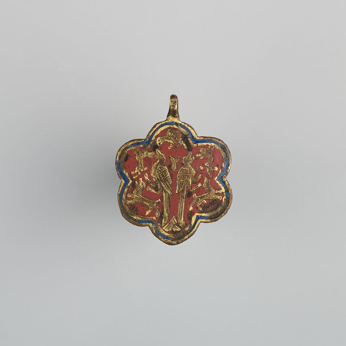Heraldry, or coat-of-arms, were vitally important in Europe throughout the Middle Ages and the Renaissance. Heraldic emblems were used to identify noble families, cities, regions, and even countries. In addition to being displayed on shields and flags, heraldry was incorporated into architectural decoration on the interior and the exterior of buildings, on furniture, works of art, clothing, and horse equipment. Harness pendants, like this example, would have been attached to a headstall, bridle, or other straps making up the tack of a horse ridden by a nobleman or noblewoman, or a member of their household. Many harness pendants also have decoration that is simply ornamental, or have symbols that are not specifically heraldic in nature.