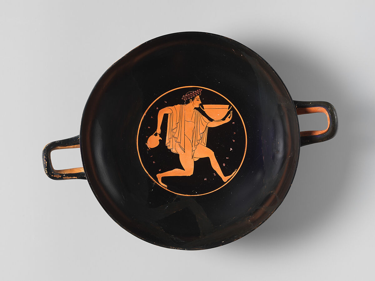 Among the very early red-figure artists who specialized in kylikes, Epiktetos was one of the most accomplished. The ease of execution, combined with the elegant simplicity of the shape and decoration, represents Greek vase-painting at its finest. It is certainly intentional that the skyphos is so much larger than the oinochoe and that it is balanced on his forearm.