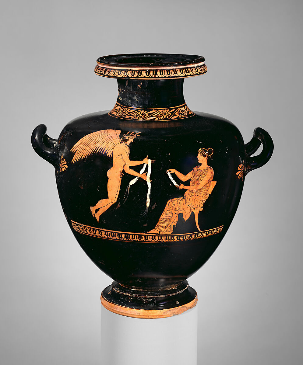 Both Eros and the woman are holding fillets (bands). Eros wears a special crown consisting of a diadem that comes to a point over the forehead and is embellished with leaflike projections.