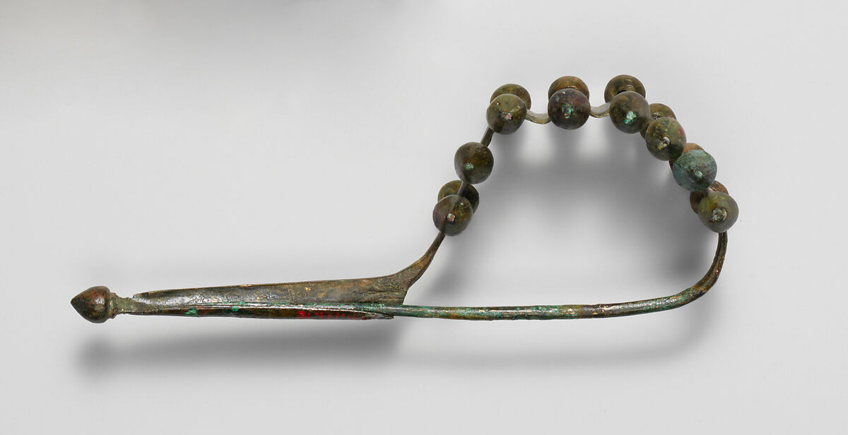 Dragon-type fibulae are a later variant of the serpentine type. With an elongated clasp and a bow embellished by pairs of bronze bud-like knobs separately made and attached to the bow by a central spike.