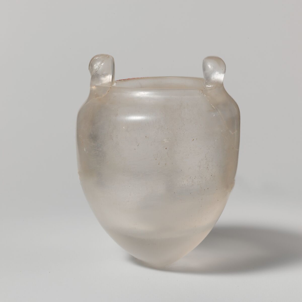 The two vertical lugs are pierced to accommodate a string for suspension, or conceivably a missing lid. Rock crystal, a precious stone in antiquity, was thought to be a special form of real ice.