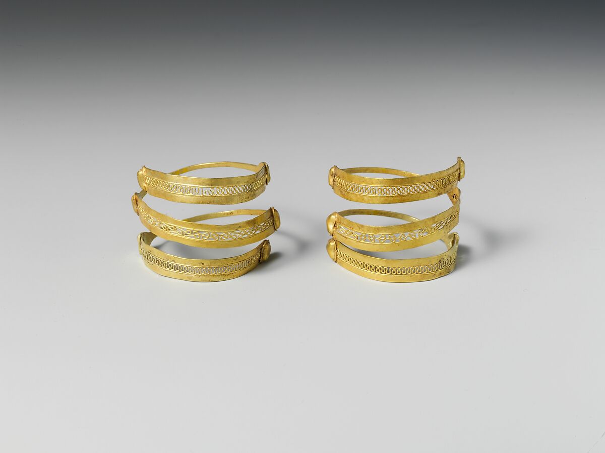 Filigree; three wide bands connected by narrow strips; heart shaped terminals are at either end of the bands.