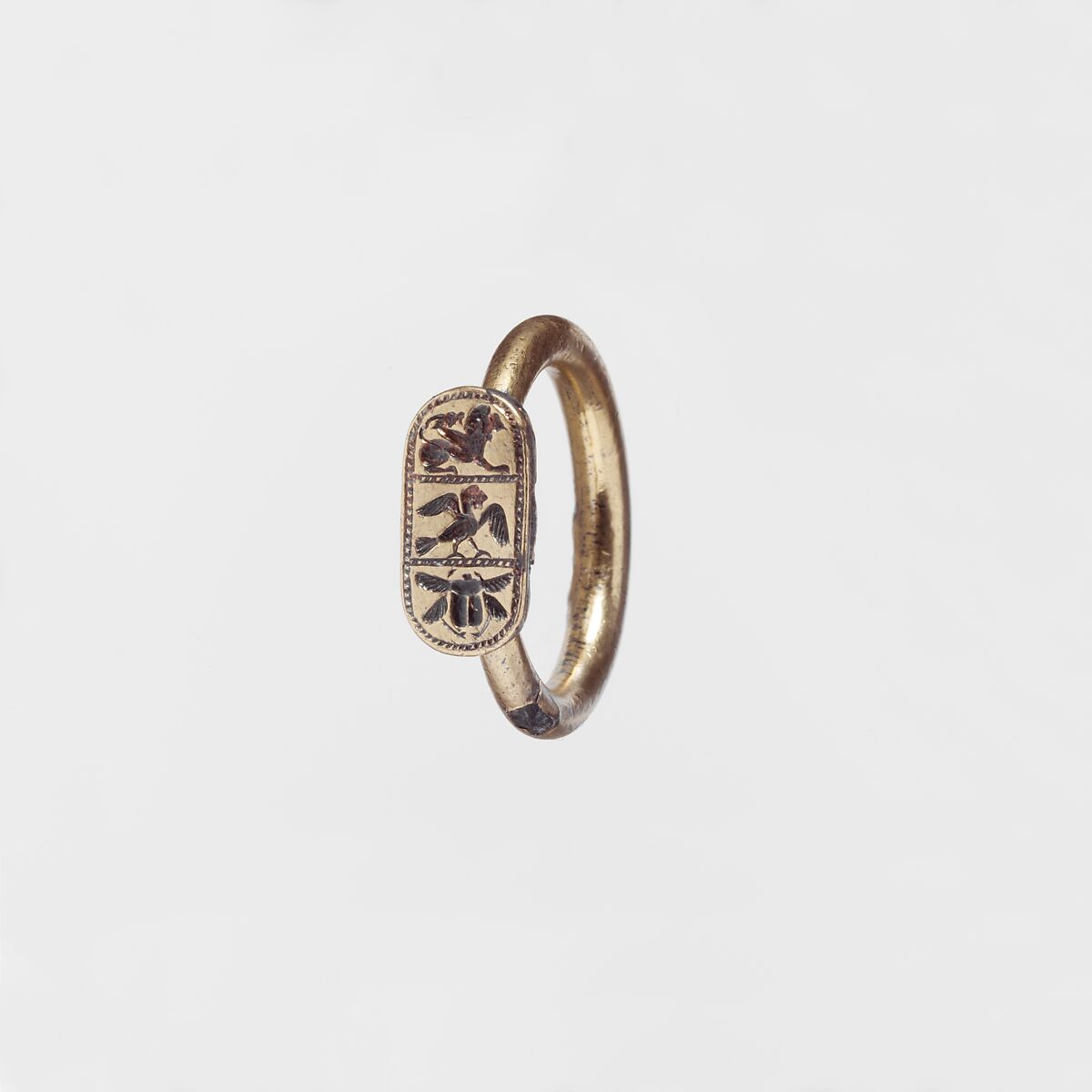 The bezel, in the form of a cartouche, is decorated with a winged lion, a siren, and a flying scarab beetle.