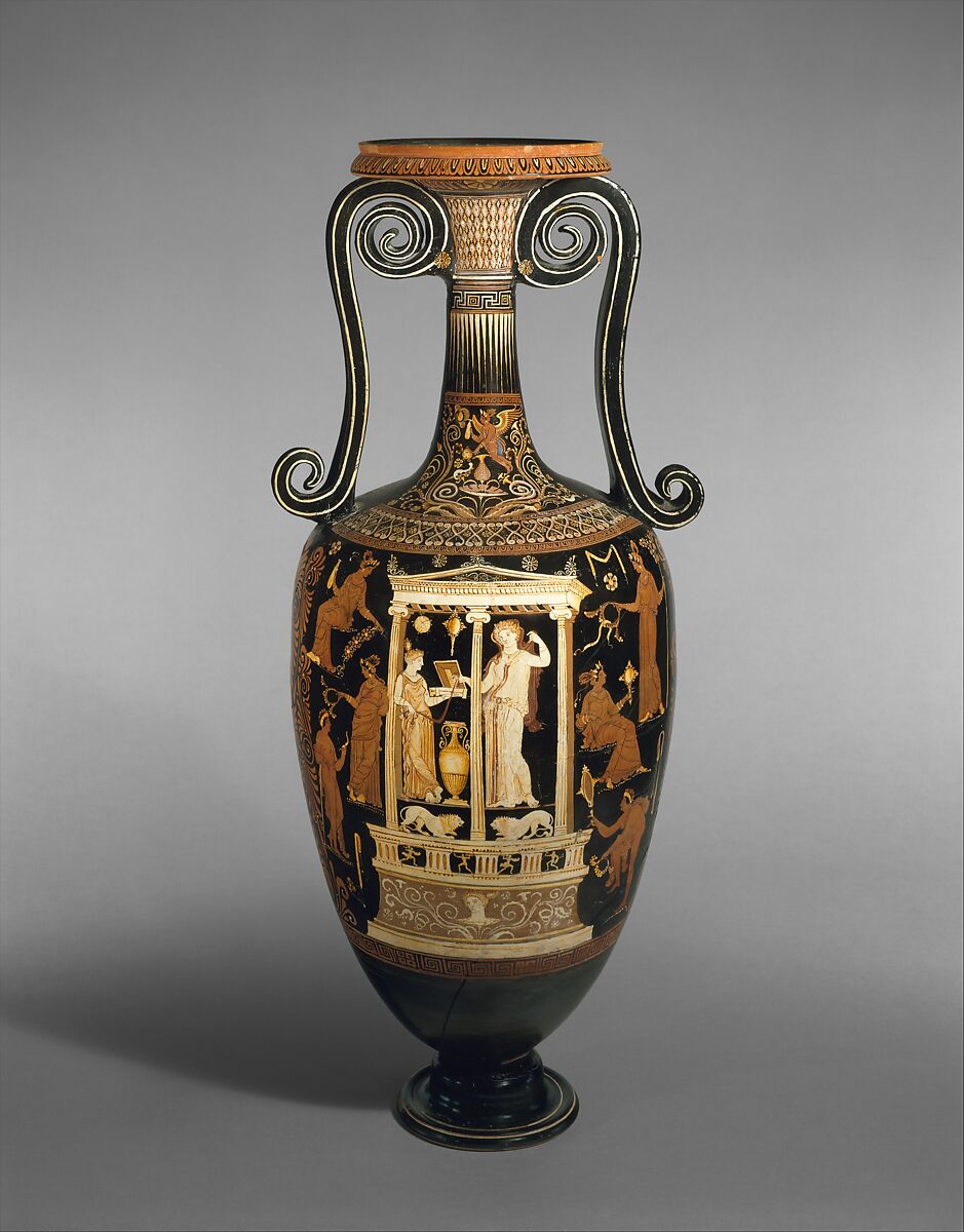 This imposing and beautifully executed vase, together with its counterpart exhibited here, is of exceptional interest for the architectural structure on the obverse. A small naiskos, rendered with three columns, encloses a woman, her maid who holds out a small casket, and a metal loutrophoros. Between the level on which they stand and the podium for the shrine are two panels with a pair of confronted lions. The podium itself consists of an upper frieze of triglyphs, alternating with metopes showing Greeks fighting Amazons. The lower element is covered with tendrils enclosing a female head. Although naiskoi are common on Apulian vases, the complexity and elaboration here are unusual. The unresolved question is to what extent the representation reflects actual funerary structures and the limestone reliefs