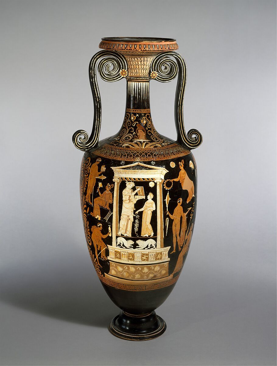 funerary. From its origins in Athens, the loutrophoros was associated with weddings and with rites for those who died unmarried. The iconographical formula of figures