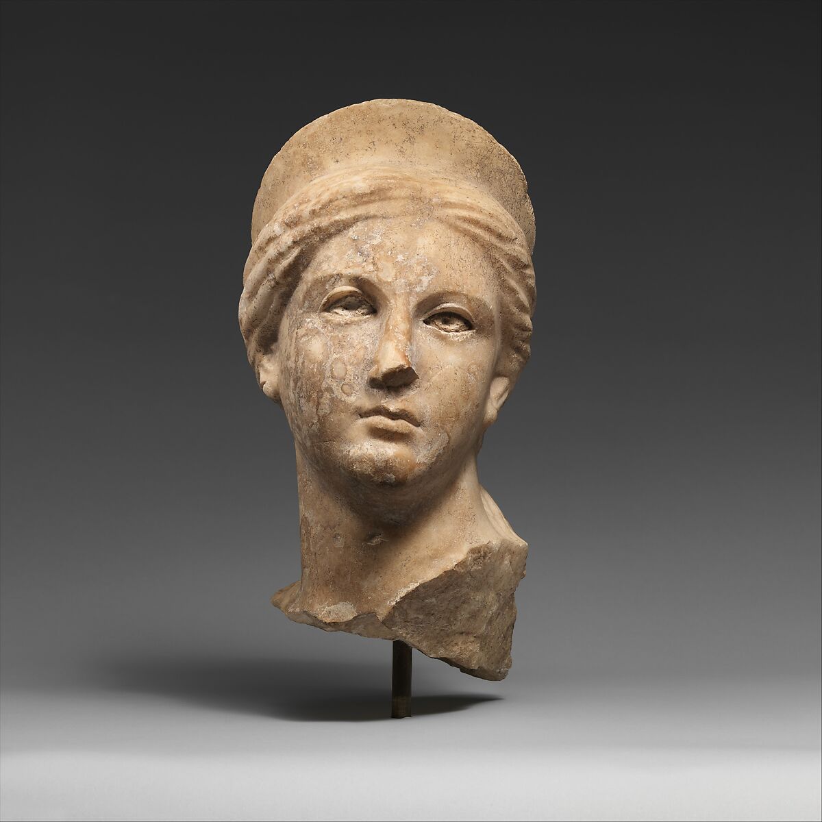 The idealized features and crown identify this striking portrait as the image of a goddess, perhaps Aphrodite or Artemis. The pale translucent yellow hue of the calcite alabaster, now discolored from centuries of burial in the earth, would originally have contrasted with the pure white of her eyes, made of chalk, which once featured inlays for the irises and pupils. Earrings of gold or another contrasting material would have hung from her pierced ears. Other details, such as the decoration of her crown, were surely rendered with paint. The goddess's hair, parted at the center of the forehead, is pulled back in two rolls along the sides of the head and braided at the nape of her neck, where the ends rest against her skin just above the upper edge of her garment. The dramatic turn of her head, the unfinished top above the crown and the fact that the artist paid less attention to the back indicate that the statue was a dynamic, full- figure portrait meant to be viewed from below. Originally it may have been set on a pedestal in a niche.