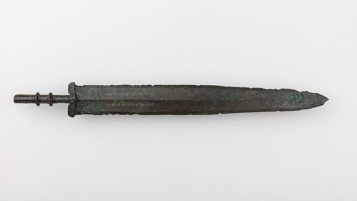 In its complete state, this excavated bronze sword would have included an integral disk-shaped pommel positioned perpendicularly to the axis of the grip. The double-edged blade bears on one side an inscription that seemingly records the circumstances of the sword's manufacture. However, the execution of the writing suggests that the inscription is either a modern addition or an original text that was defaced when the original characters were engraved over in a misguided attempt to make them clearer.