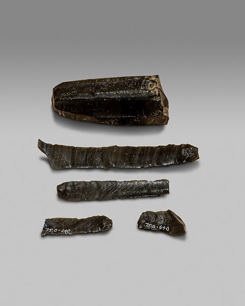This work of art is currently on loan to the museum.Sculptors in the Cyclades used obsidian blades like these to carve figures and vessels from marble. However, unused obsidian blades and the cores from which they were made were also a regular feature of burial assemblages in the Early Cycladic period (3200–2000 bce). Geochemical analysis of the obsidian used throughout the Cyclades has determined that two sites on the island of Melos were the main sources of the volcanic glass.