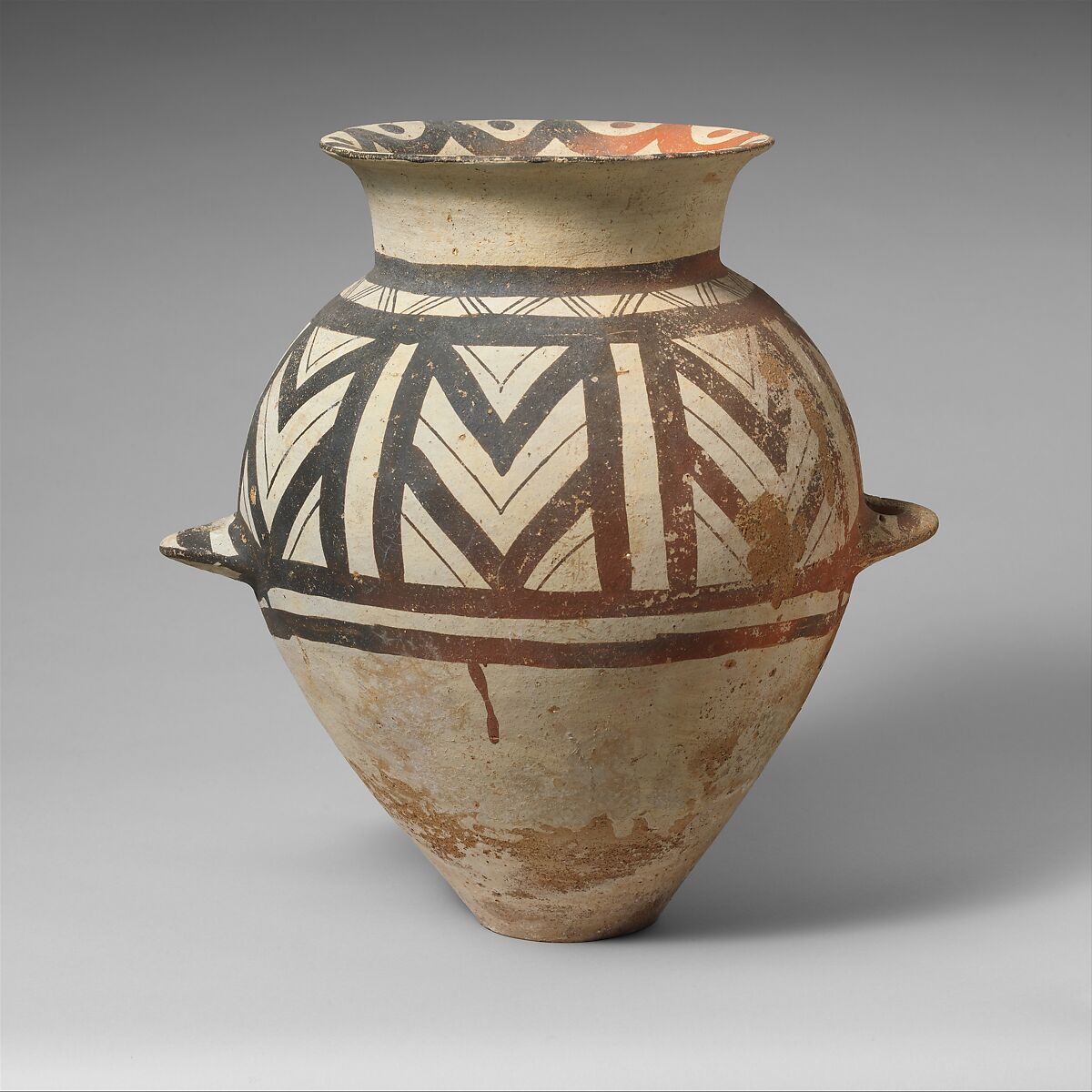 The painted decoration of the jar is similar to that of the kernos, with rows of alternating narrow and broad chevrons and designs in dark glaze over a white slip. The jug is more extensively decorated with comparable motifs. All three vessels represent Cycladic pottery at its most precise and accomplished, and presumably they came from the same tomb, possibly at Phylakopi, the primary Cycladic settlement on the island.