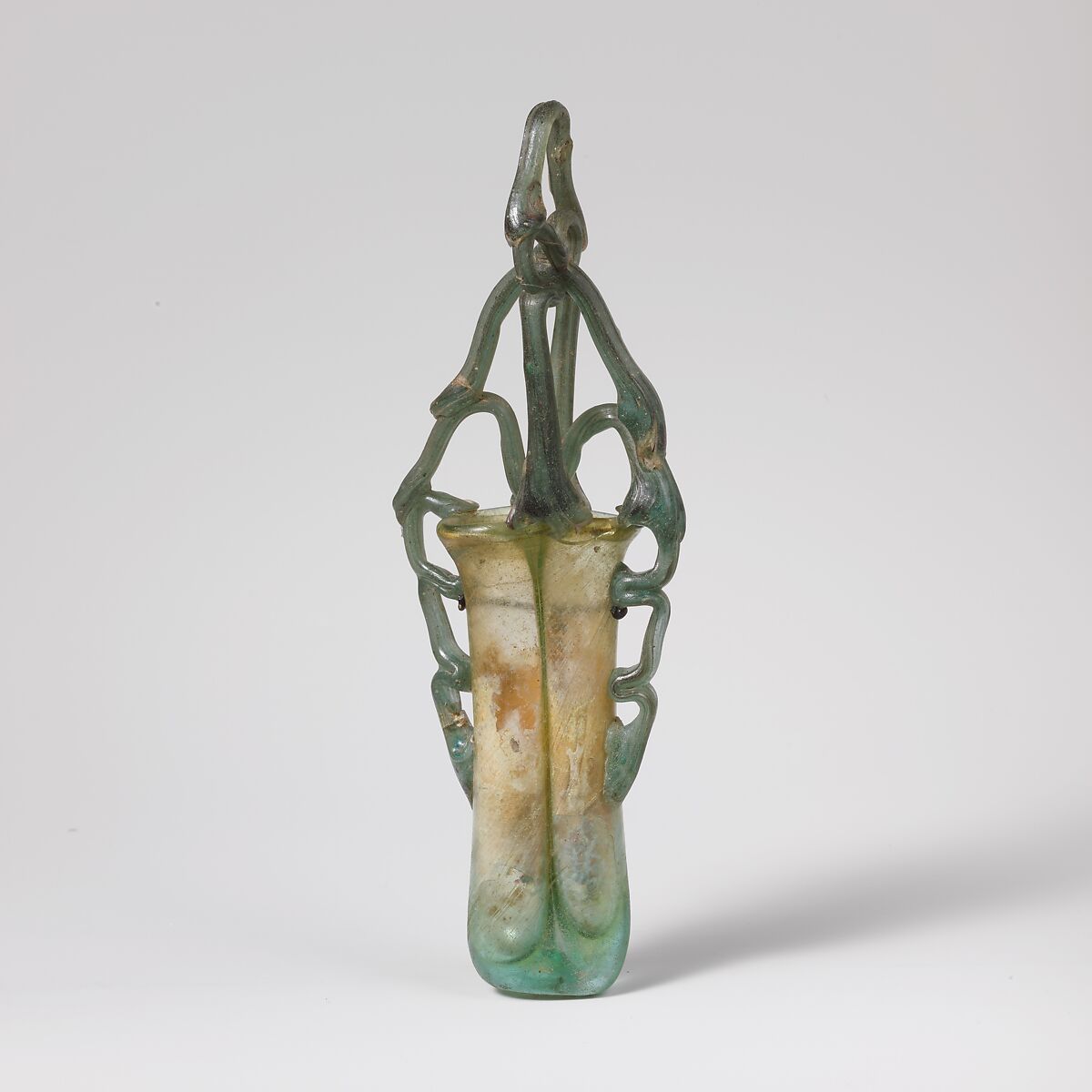 Everted rim, folded in and down sides of neck; body comprising two tubes, side by side, made from a single inflated gather by pinching sides vertically to make diaphragm; thick, flattened bottom with pontil scar; basket handle made from seven separate rods: on sides of body, two trails applied as pads, drawn up vertically in three tooled, angular loops, ending on top of rim; M-shaped trail applied as a large pad on top of one of the side trails, drawn across mouth to rim at junction of the two tubes, and ending on top of the other side trail; above this, trail drawn up and down, with acute angle at apex; then two trails applied to rim on either side of junction of the two tubes, draw up vertically, tooled in, and formed into two small round loops above, ending on top of apex; final trail applied to top of loops and drawn up and down, with acute angle at apex.