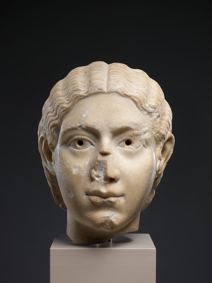 The hairstyle follows a fashion set by the Severan court in the early third century. The pupils of the eyes were originally inset; the nose was broken and restored in antiquity.