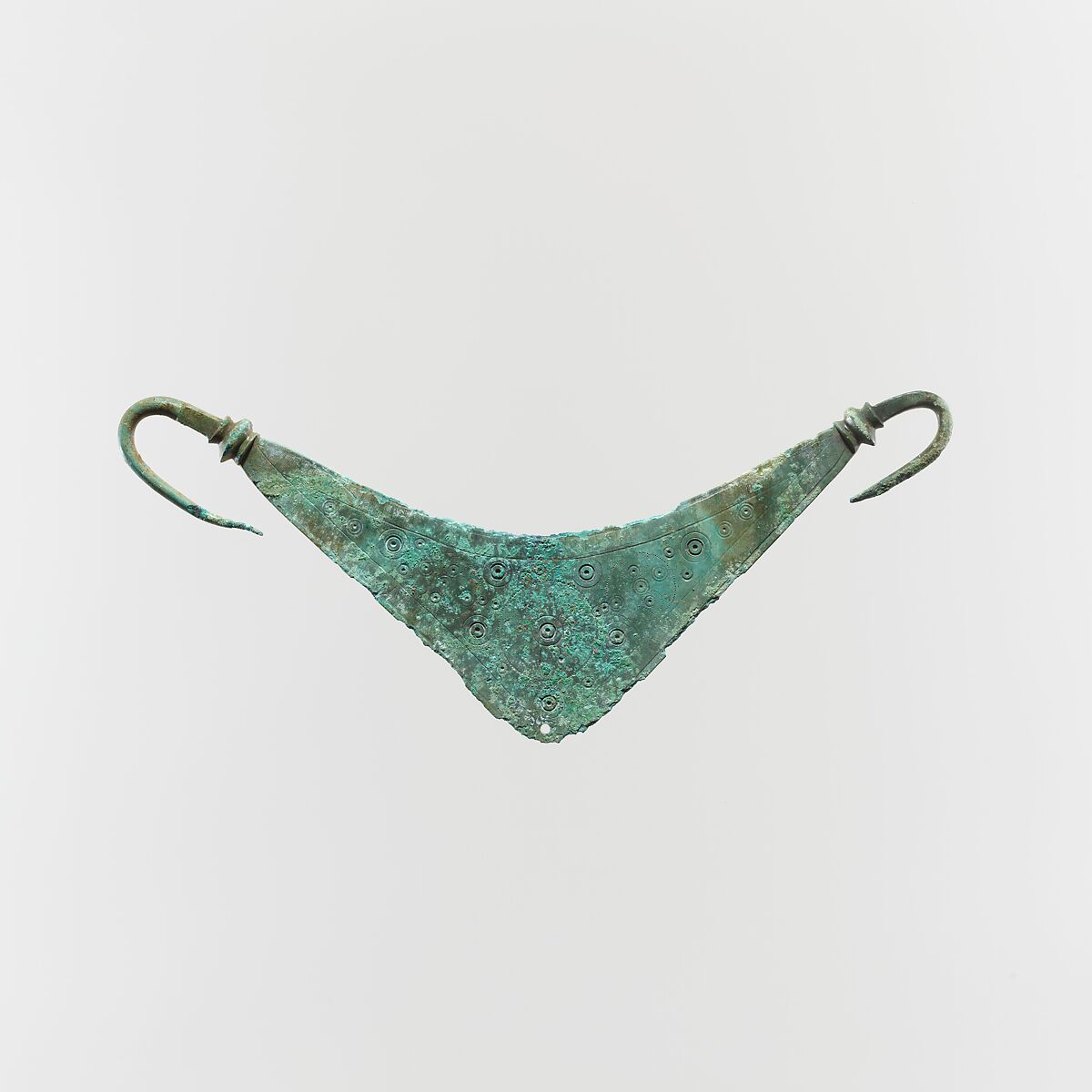 This type of personal ornament is characteristic of northern Greece, particularly Western Macedonia and Thessaly. The extraordinary delicacy and technical mastery in the execution of the triangles and concentric circles are especially noteworthy. A similar object was discovered in a woman’s tomb at Kozani (modern Greek province of Macedonia), placed on the body’s pelvis, indicating its function as belt clasp or hanger.