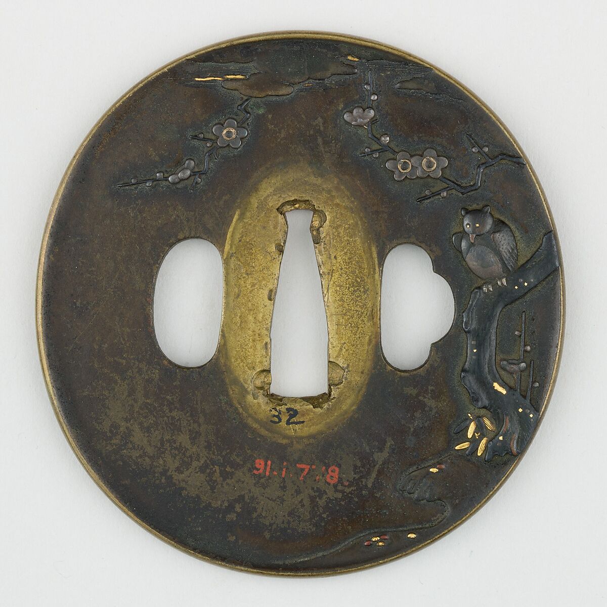 The obverse of this tsuba shows a plum tree with a horned owl (Japanese: mimizuku, 木菟) with one of the branches stretching onto the reverse. Most parts of the plate have been left undecorated and towards the top we see some clouds with gold accents.