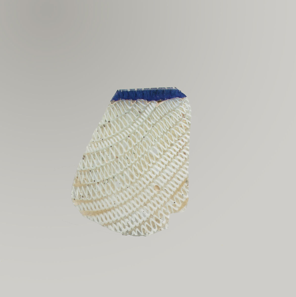 The body of the vessel, probably a hemispherical bowl, is decorated with lengths of glass comprising a colorless cane wound spirally with parallel threads in opaque white glass. The rim is marked by a separate cane of blue and white threads.