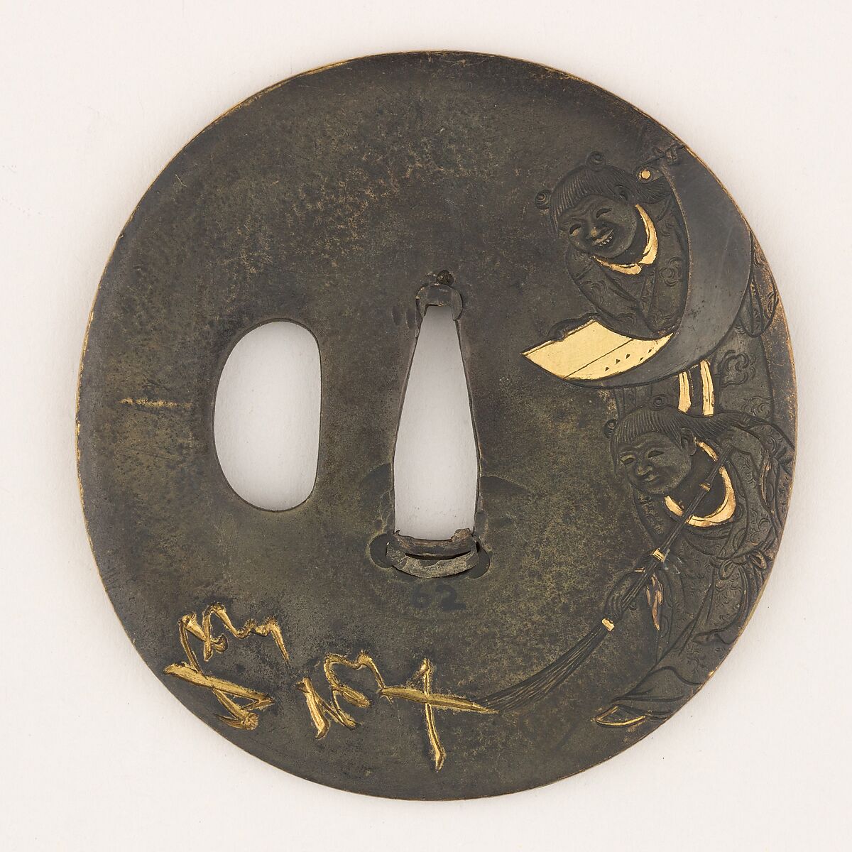 The obverse of this tsuba shows Hanshan (寒山, Japanese: Kanzan) and Shide (拾得, Japanese: Jittoku), popular figures in Zen painting, with their attributes scroll and broom respectively and with Shide performing water calligraphy of the characters for "Enlightenment." The reverse is left undecorated and the rim is highlighted in gold.