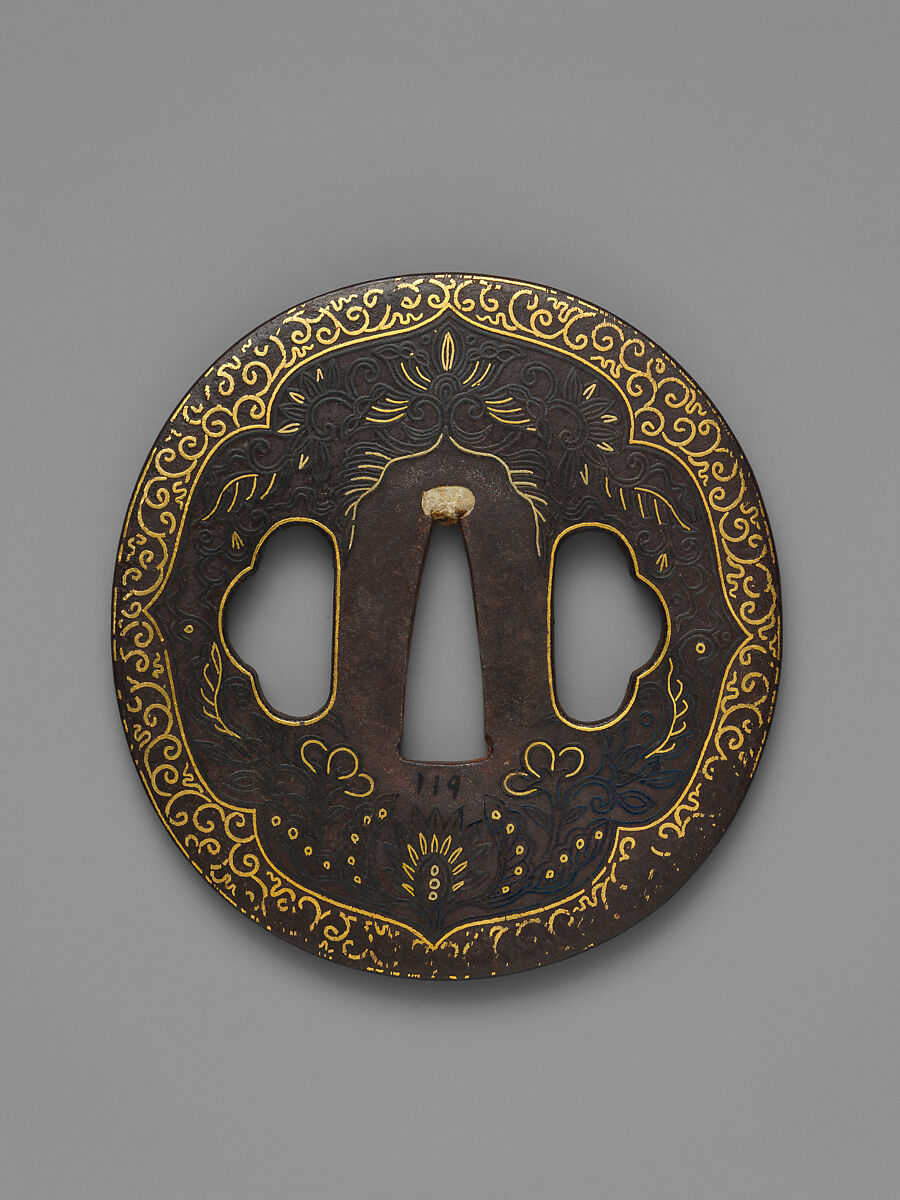 - Title: Sword Guard (Tsuba) Depicting Biting Lion Heads (Shikami) and Arabesques (獅噛唐草図南蛮鐔)