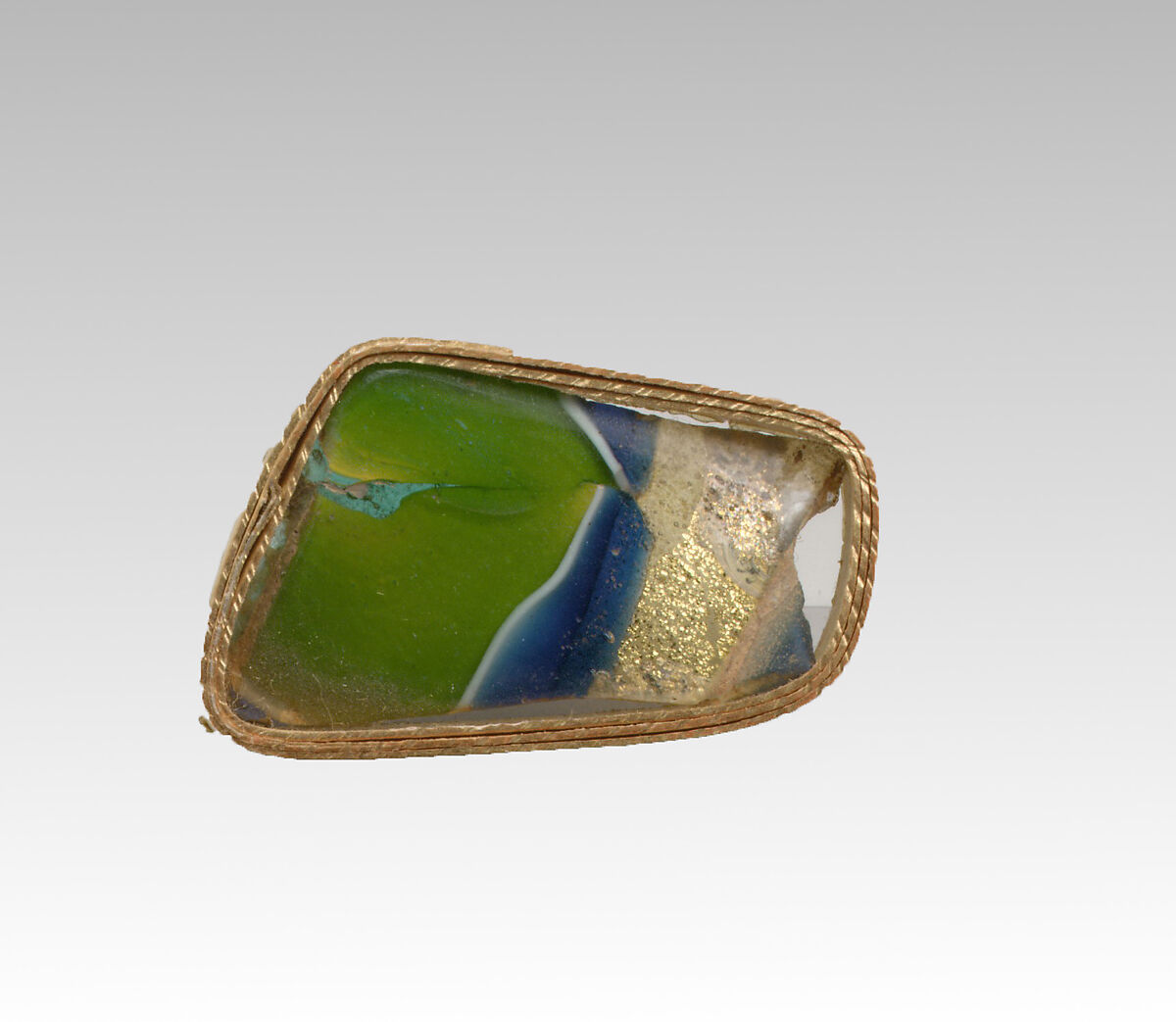 Translucent blue, turquoise blue and yellow appearing green, opaque white, and colorless enclosing gold leaf.