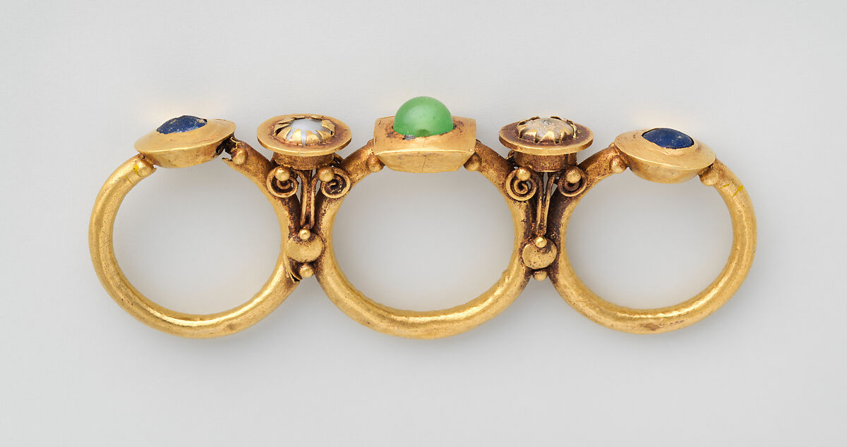 This ring exemplifies a flamboyant type of costume jewelry that was especially popular in the eastern half of the Roman Empire. The three finger bands support five colorful settings, containing pearls, glass imitation gems, and a central green bead (a modern replacement).