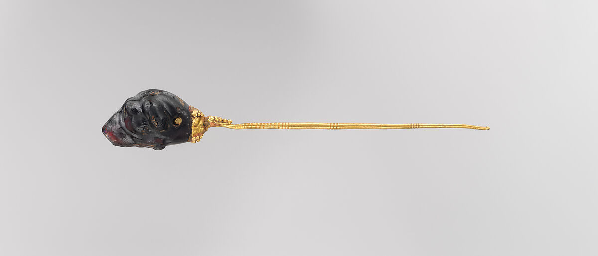 Gold pin wth an obsidian finial in the shape of an animal's head.