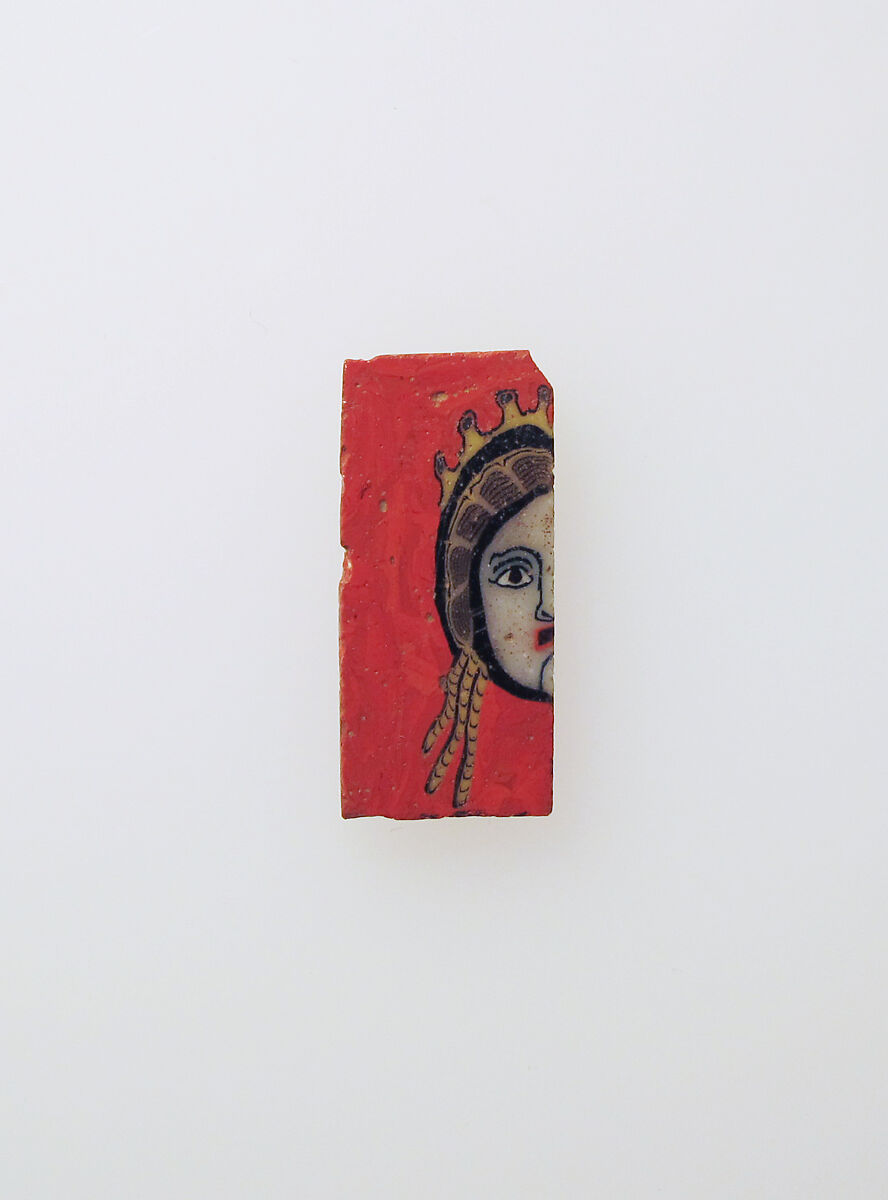 Proper right side of female head with white face, outlined in purple; features delineated in blue, with red lips; hair in rows of purple tresses outlined in yellow, with three corkscrew curls hanging below side of face; above hair, another thick outline in purple and yellow diadem with four projecting spikes.