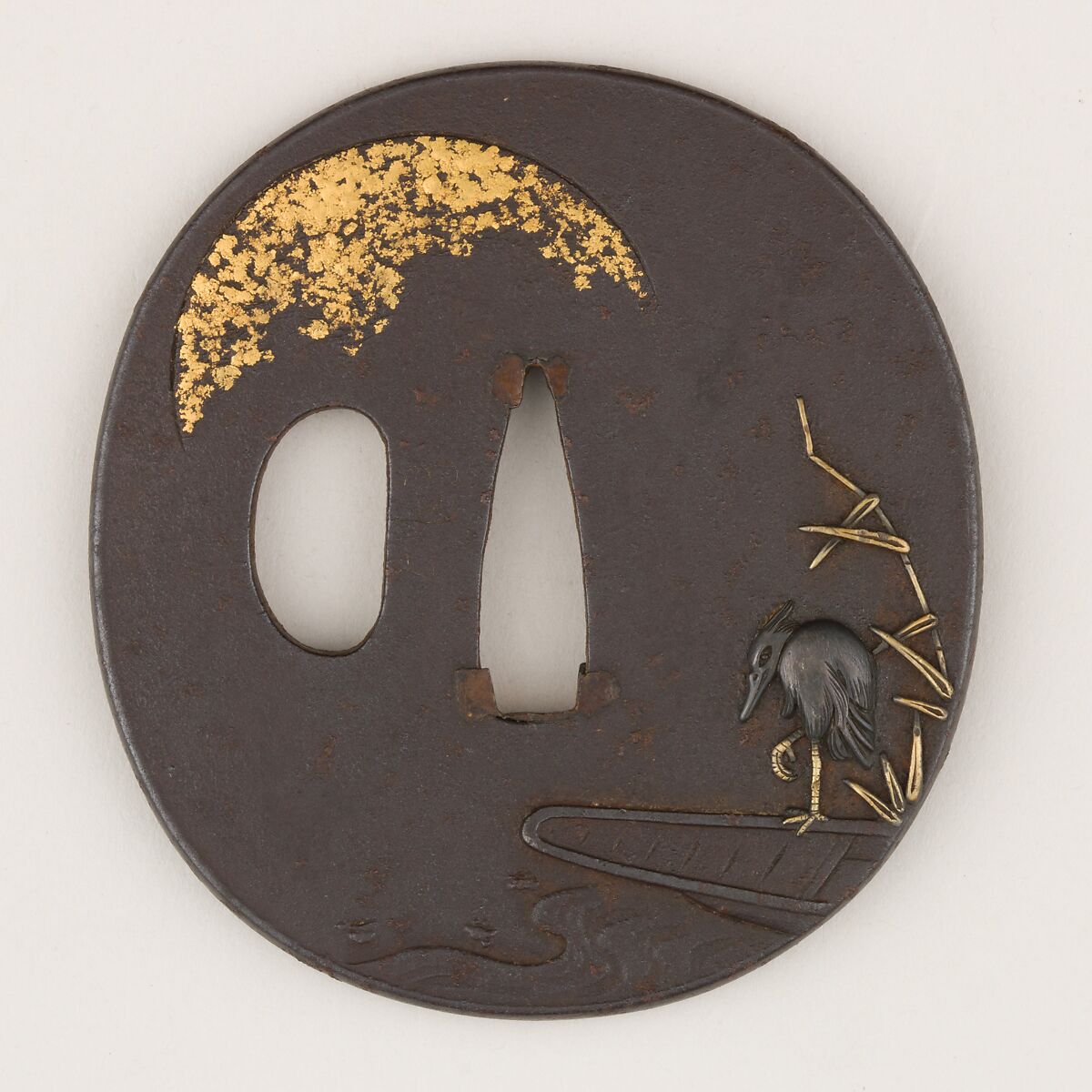 This tsuba shows on the obverse a heron standing with one leg raised at the edge of a boat, a symbolism that represents such a peace and calmness that it was therefore traditionally associated with wishing someone a "safe journey" (ichiro-heian) in Japan. The upper left area shows a rising sun and on the reverse we see the moon and towards the bottom a small rock formation, small bamboo, and running water.