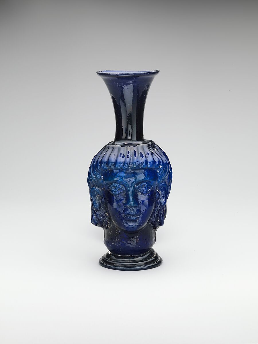 Intact, except for a small chips at proper right side of head and in base ring; slight encrustation and faint dulling.