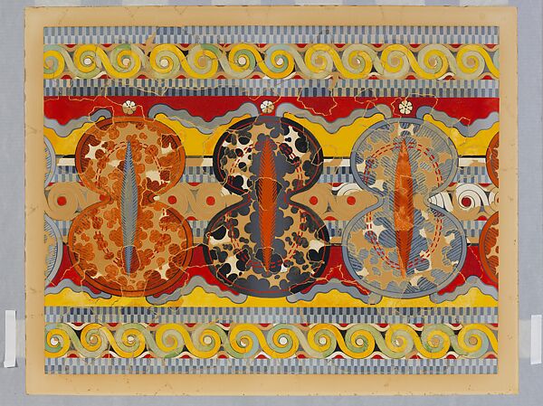 The original restoration was done by E. Gillieron, pere from over two hundred fragments for the German Archaeological Society. Evans used it as the basis for his grand restoration of the shield frescoes in the Domestic Quarter at Knossos (executed by E. Gillieron, fils) where only very small fragments of large-scale shields were preserved. The distinctive figure-of-eight shield motif is an important visual link between Homer's Age of Heroes and Late Bronze Age Greece. It has been suggested that the green pigment of the original fresco was made from powdered malachite imported from Egypt.