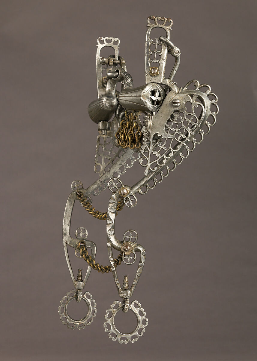 Used for dressage or leisure riding, this bit is also entirely adorned with chiseled and pierced vegetal and geometrical motifs, typical of the decoration used by the spur makers in the South East of Germany in the 16th and 17th centuries. Despite their name, spur makers were not only made spurs, but also small equestrian hardware like bits, stirrups, muzzles, cavessons or curry-combs, sometimes adorned with the same intricate decoration.