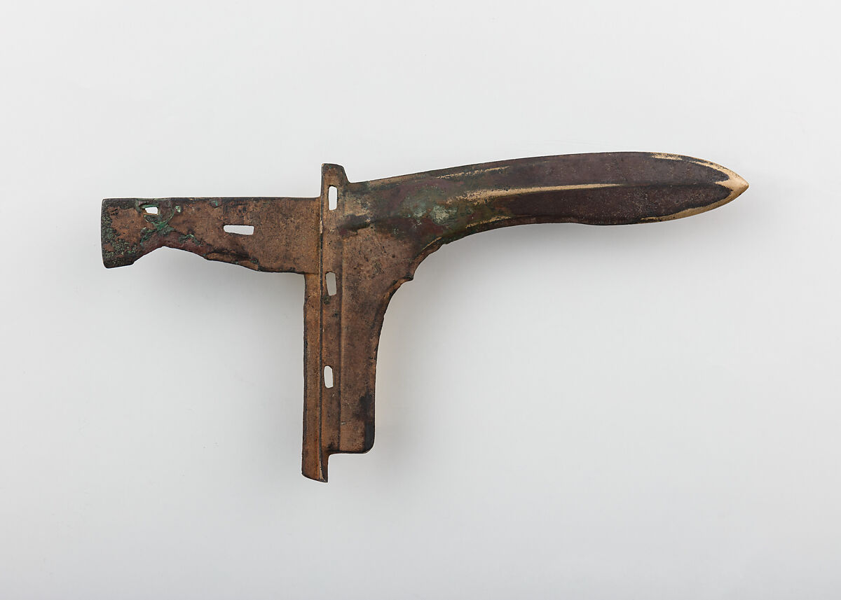 This dagger-ax is cast with series of slits to be tied to a shaft, and it is distinctive for the curved profile of its short beak. On one side it bears an inscription naming the Yan Kingdom, one of the last states to fall to the Qin Empire during the Warring States period.
